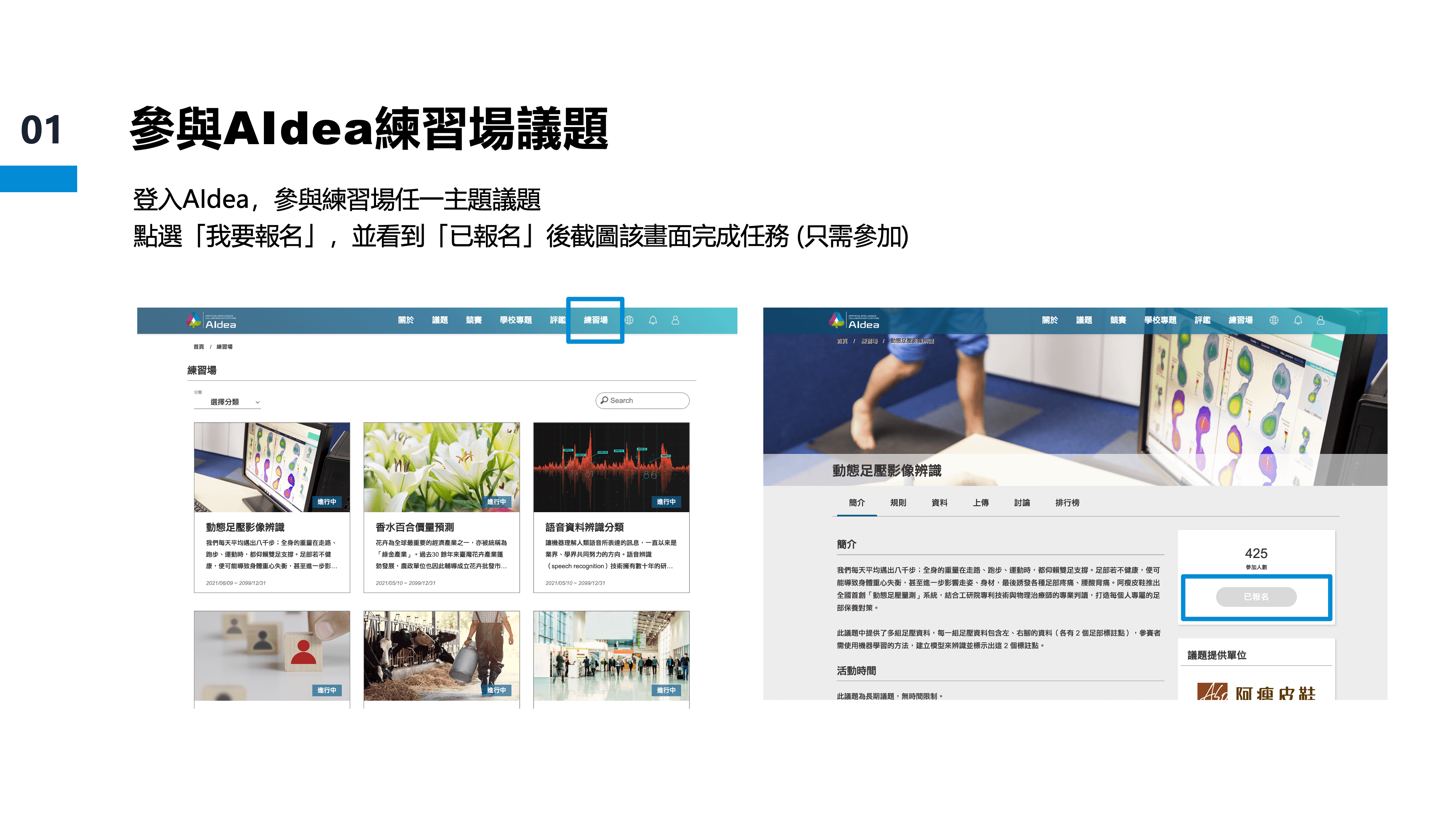 登入AIdea,參與練習場任一主題議題,點選「我要報名」,看到「已報名」後截圖該畫面(只需參加)。