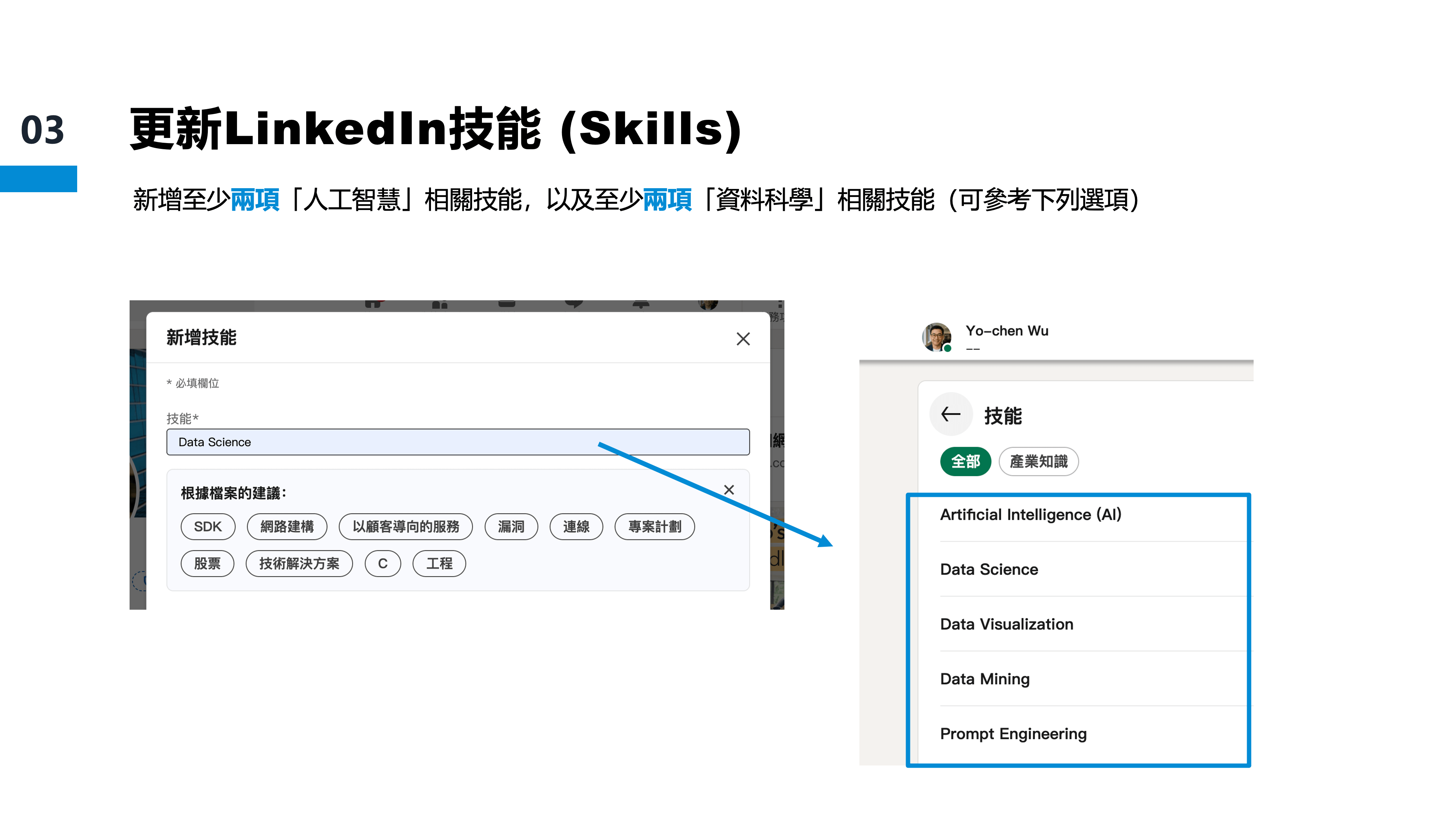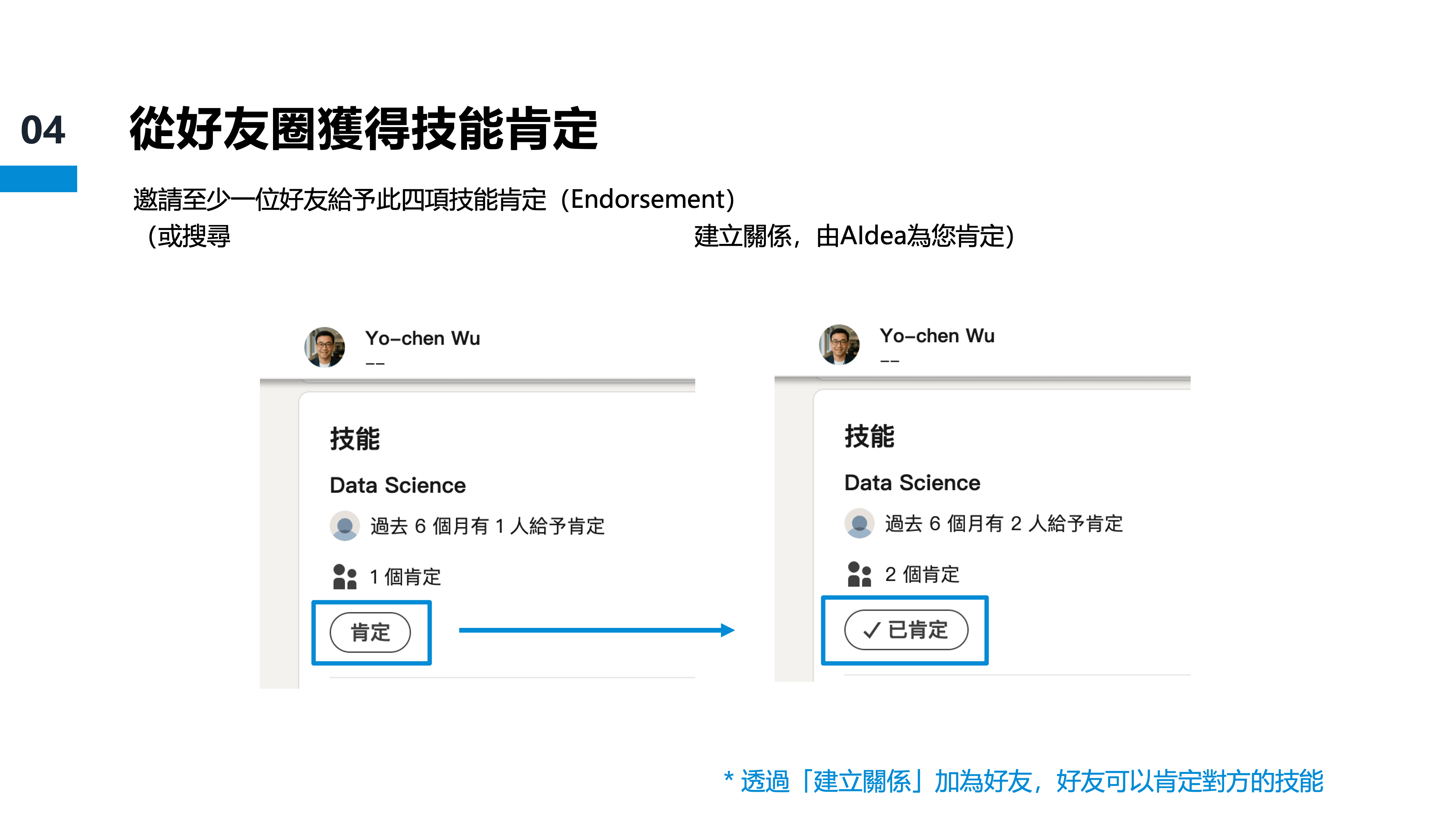 於LinkedIn更新技能欄位(新增人工智慧與資料科學相關技能),並邀請至少一位好友給予此四項技能肯定(Endorsement),完成後截圖。
